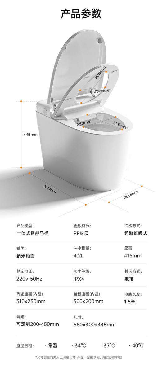 离座冲水、座温可调、夜灯照明、漏电保护、干烧保护、阻燃座圈、IPX4防水淋。
