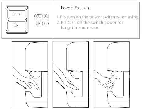 1.Firstly put the back of hands to the wind outlet for drying, then turn over the hands to dry the palm. Repeat it 2 or 3 times to finish drying.