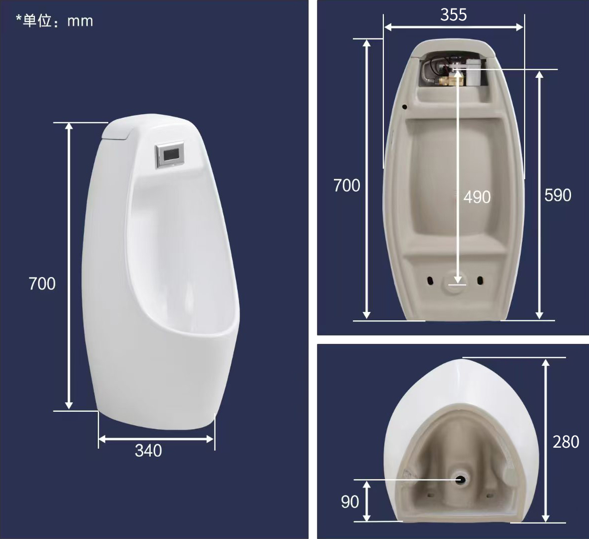 亮点:挂式陶瓷感应小便斗,外观小巧轻便,迎合现代潮流。